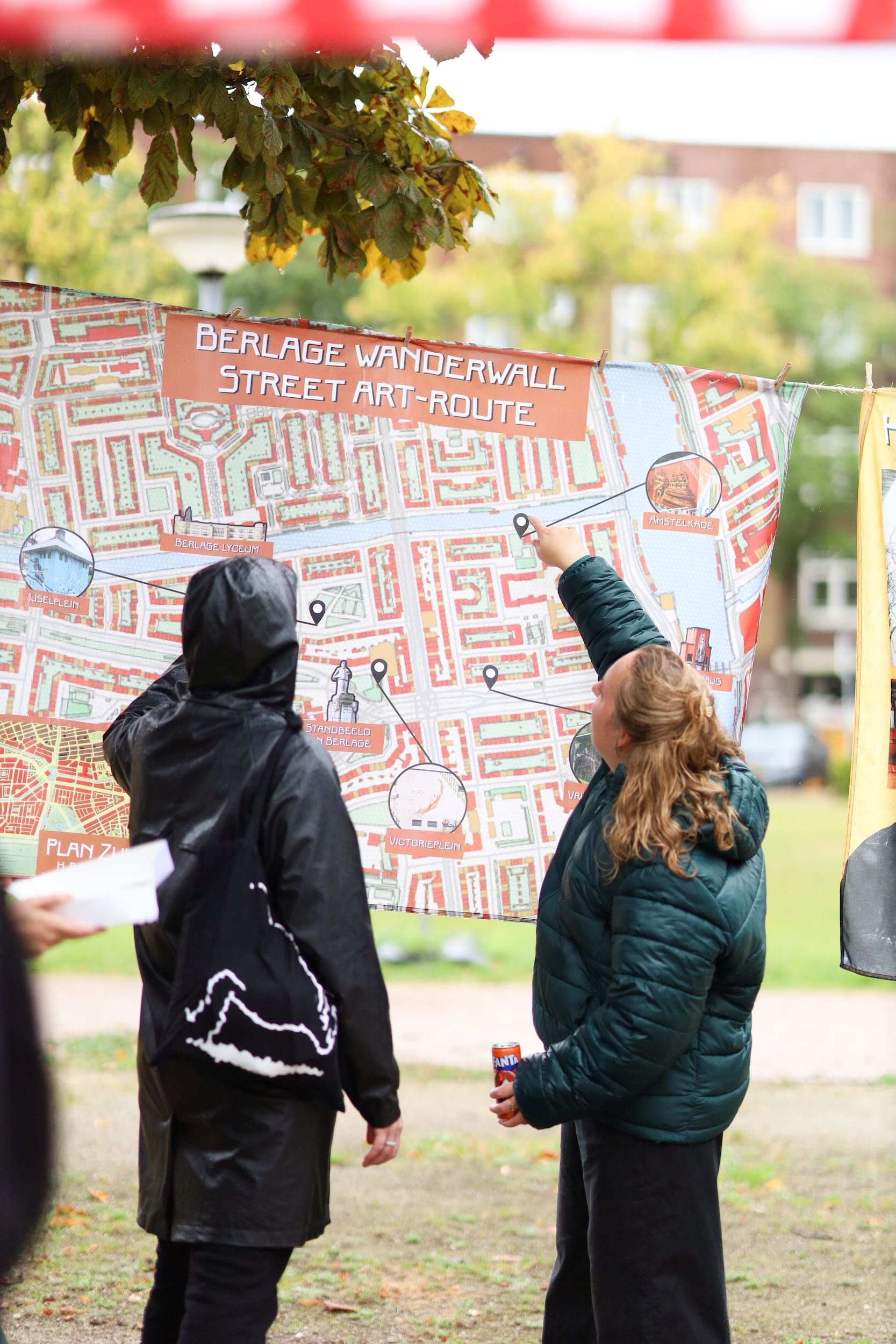 De Berlage Wanderwall is een project van vijf kunstenaars die ieder hun eigen stem en discipline inbrengen: Nicky Nahafahik (street art), Amara van der Elst (spoken word), Esmay Usmany (muziek), Dido Drachman (illustratie), en Rizky Kalebos (urban influencer).