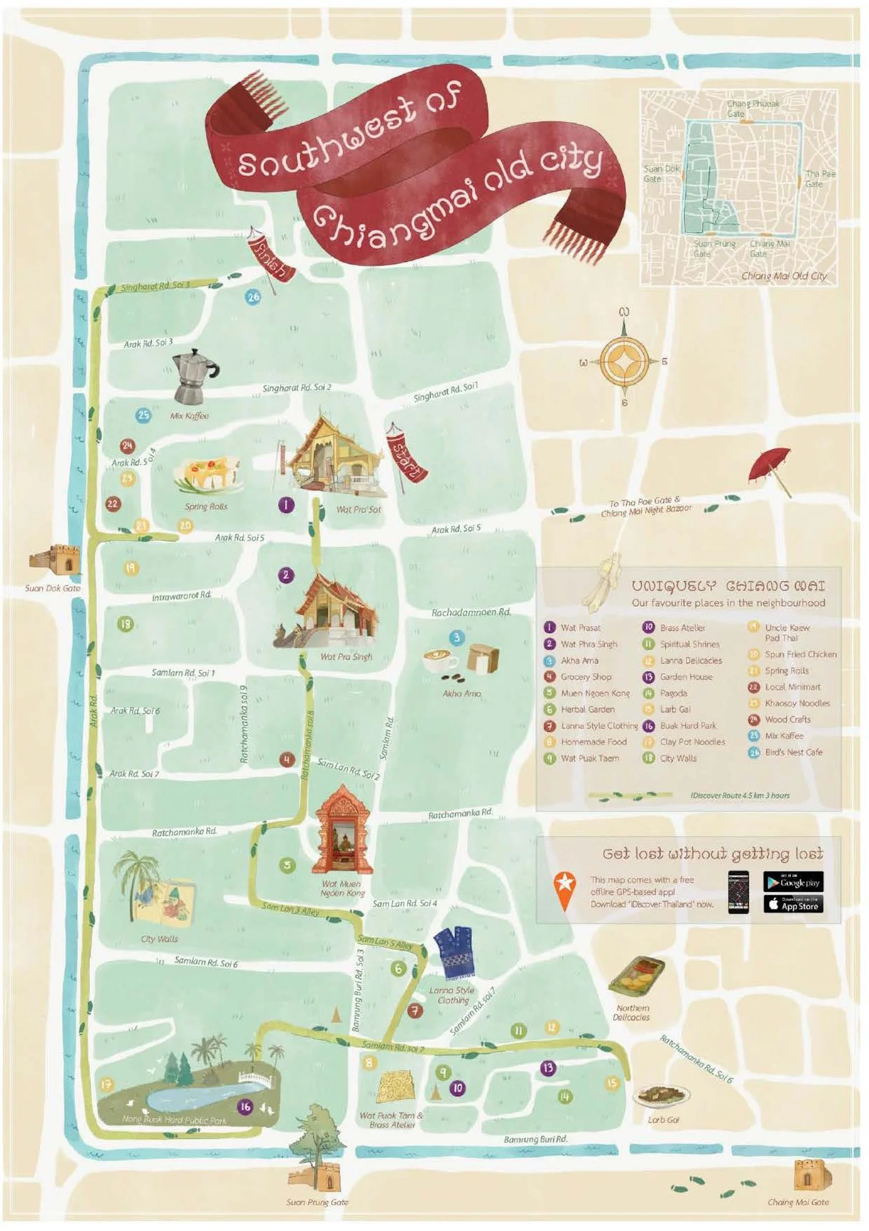 The sites were documented on an illustrated map and in a digital heritage trail that were showcased at the Chiang Mai Design Week 2017, along with a sharing session about the Muen Ngeon Kong neighbourhood with the workshop participant. The map, illustrated by local artist Roong Tsupatcha won the Chiang Mai Design Award for socially responsible graphic design! Through this mapping and storytelling project, local community members felt more proud of their culture and heritage. The mapping exercise strengthened their sense of pride and belonging to the community.